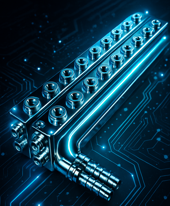 一詮精密具備高效岐管製作能力,透過精密加工與流體模擬設計,確保冷卻液在各通道間均勻分配,提升整體液冷系統效率與穩定性。